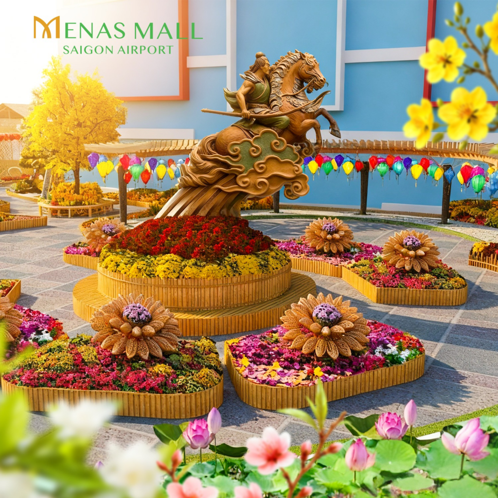 MENAS 西贡机场购物中心的丙午年春节花街 2026以越南民族英雄**圣童壮士(圣童壮士·铁马)**的经典形象为创作灵感。铁马象征着坚韧不屈的精神与民族豪情。以“扶董天王·腾飞的渴望”为主题,花街生动再现了圣童壮士从乡村少年成长为英勇战士、肩负守护山河使命的传奇历程。